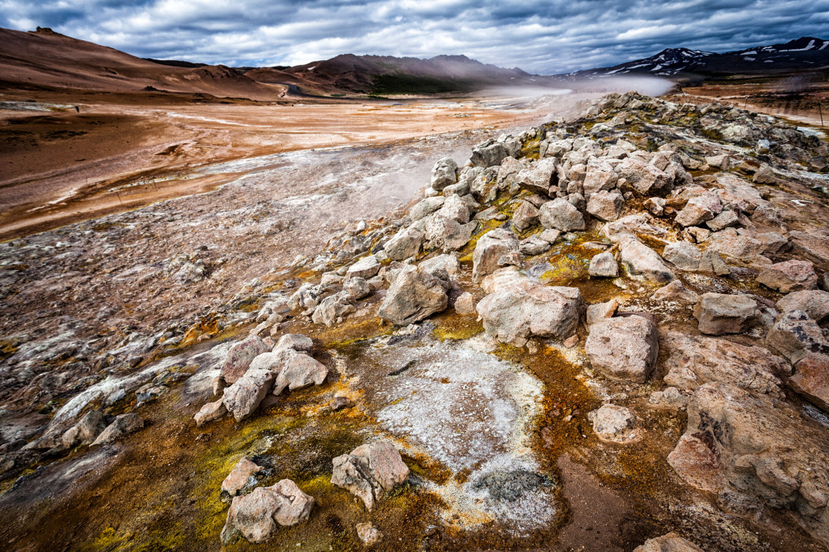 Spätestens als wir die mondähnliche Landschaft von Hverir sehen, ist unsere Laune wieder oben auf und der Plan, heute nichts zu machen, dahin. Selbst die Sonne lässt sich blicken und so nutzen wir die Gunst der Stunde und spazieren zwischen dampfenden Gesteinsgebilden, farbenprächtigen Bodenstrukturen und blubbernden Schlammlöchern vorbei. Ein Anblick für Halbgötter und da es direkt an der Ringstraße liegt, ein Stopp den man sich nicht entgehen lassen sollte.